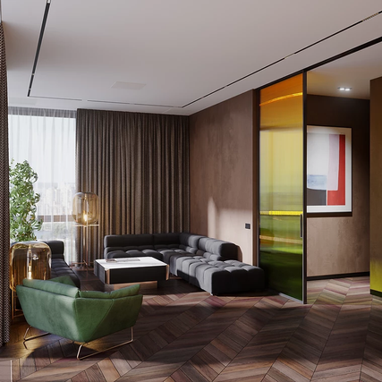 A harmonious combination of textures, textures, and materials in warm rich colors of a contemporary setting. Amber-gold lamps and "spectral" partitions; hidden household appliances; finishing with live moss. Laconic and warm!